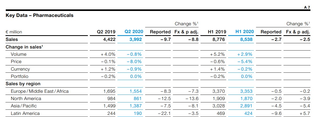 Su unidad de Pharmaceuticals, la segunda en importancia en términos de facturación, le generó ingresos por € 8.538 millones durante el semestre, con una caída ajustada del –2.5% debido principalmente al impacto del COVID-19 y de las políticas de compra por volumen en China.