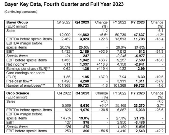 La alemana Bayer presentó este martes sus estados contables anuales, en los que reportó una caída en ventas del -6,1% a €47.637 millones. Ajustado por tipos de cambio y portfolio, el descenso fue del –1,2%. La compañía dijo que postergará los planes de dividir al grupo para centrarse en mejorar el desempeño operativo, resolver litigios y pagar deudas.