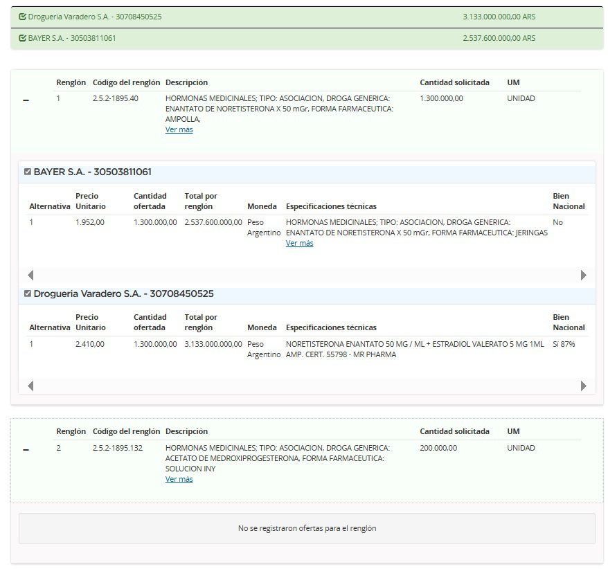 De acuerdo al desglose realizado por el equipo de analistas de Pharmabiz, una dupla de empresas se presentó en la compulsa. La alemana Bayer se anotó para el primer renglón con su anticonceptivo Mesigyna a un precio unitario de $1952 (u$s 1.96), lo que se traduce en un total de $2.538 M (u$s 2.5 M). Cabe aclarar que hay un dato llamativo: la multi ofertó a un precio inferior respecto al registrado en una idéntica contratación abierta casi dos años atrás: en ese entonces, había apuntado un precio unitario de $719.98 (u$s 4.64), lo que totalizaba $720 millones (u$s 4.6 millones*). Ver artículo 2022