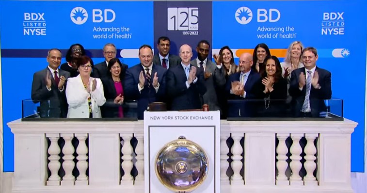 El gigante de dispositivos médicos Becton Dickinson tocó la campana en la Bolsa de Valores de Nueva York el jueves pasado para conmemorar su 125 aniversario. Tom Polen, presidente y director ejecutivo, estuvo a cargo de la iniciativa, en la jornada de cierre, acompañado por otros ejecutivos e invitados.