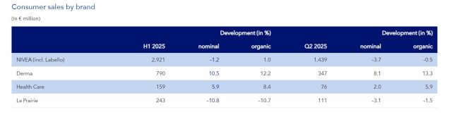En un desglose de su unidad de Consumo, el documento detalla que su marca emblema, Nivea -incluyendo a Labello– aumentó sus ingresos un 1,0% en forma orgánica a €2.921 millones. Asimismo, su cartera de Derma, que abarca etiquetas como Eucerin y Aquaphor, creció un 12,2% a €790 millones.