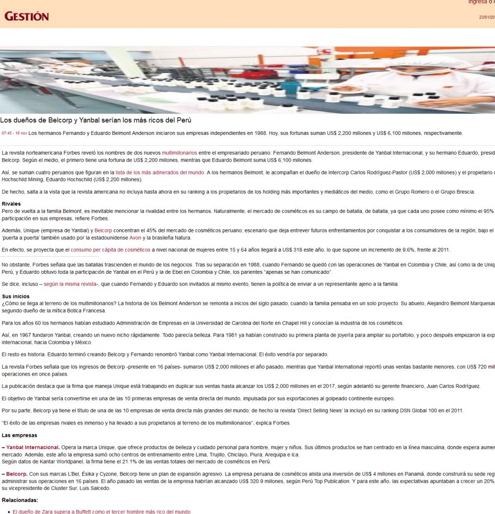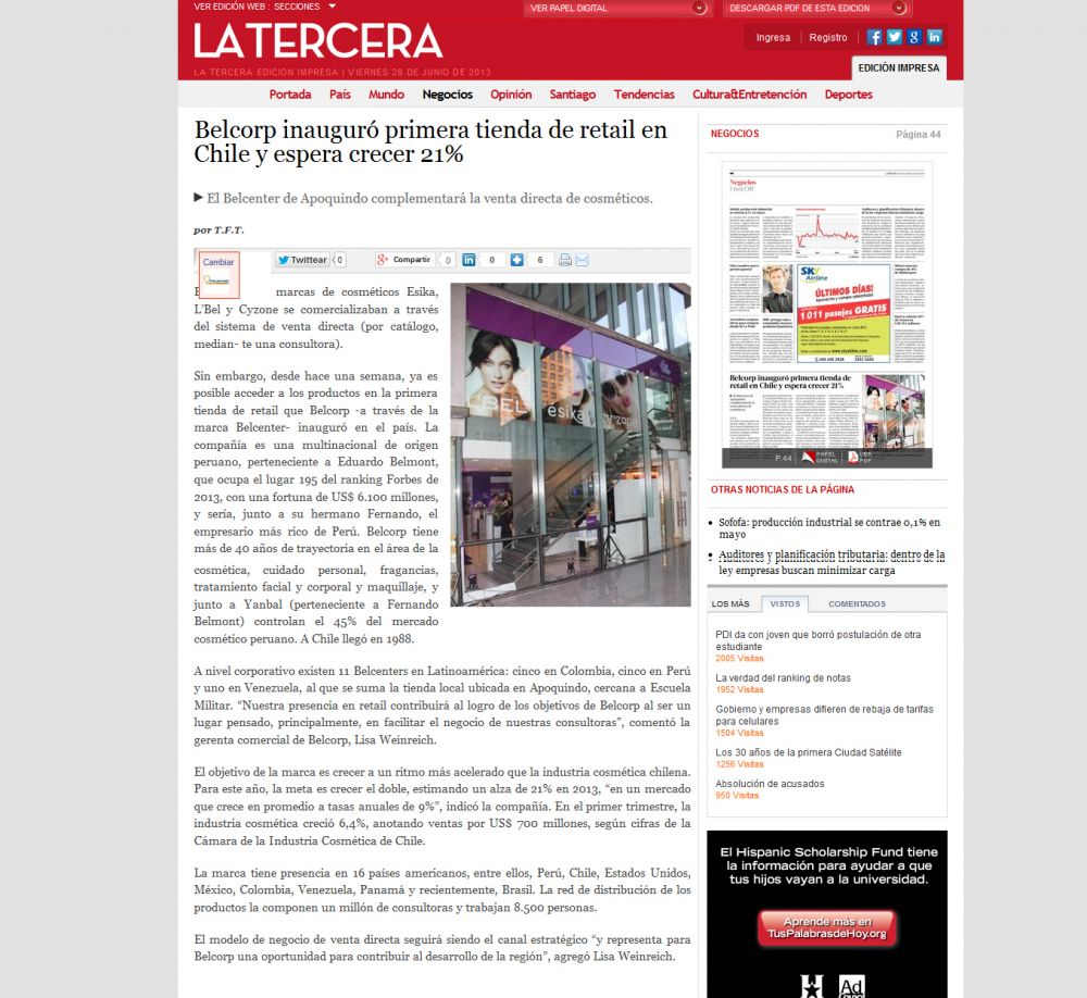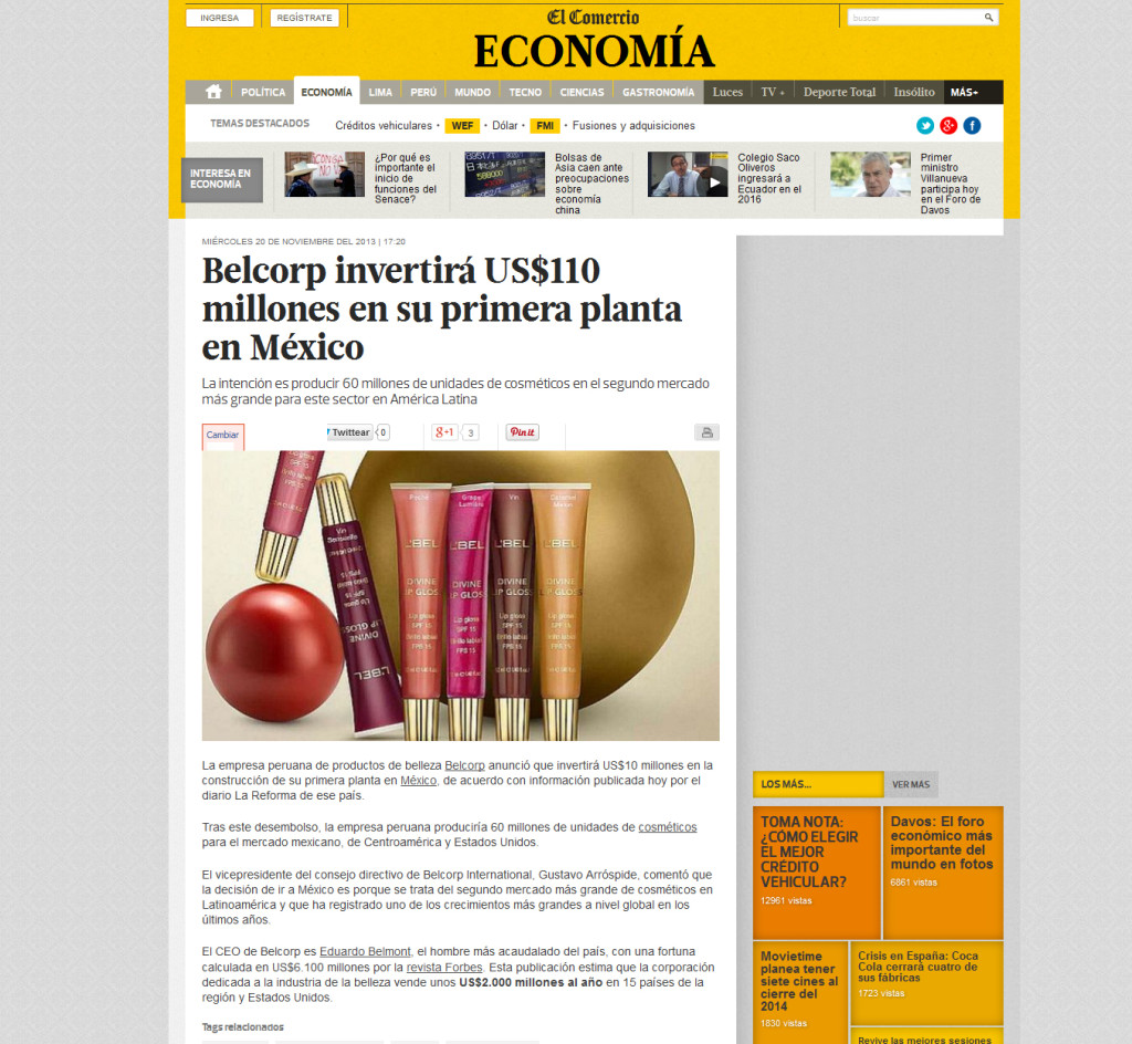Mientras tanto a Belcorp no le va nada mal en el resto del continente. En Chile, inauguró su primer punto de venta hace menos de un año, según lo publicó el diario La Tercera. También anunció la inauguración de una planta de manufactura en México en noviembre del año pasado para lo que destinará una inversión de u$s 110 millones. Ver artículo La Tercera // Ver artículo El Comercio