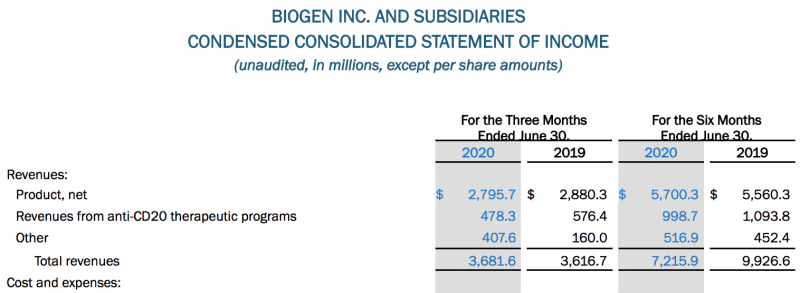 La norteamericana Biogen reportó hoy ventas por u$s 7.215 millones durante la primera mitad de este 2020, lo que significó un ligero incremento del 1.5% con respecto a los ingresos por u$s 7.106 millones que registró durante el primer semestre de 2019. Ver press release.
