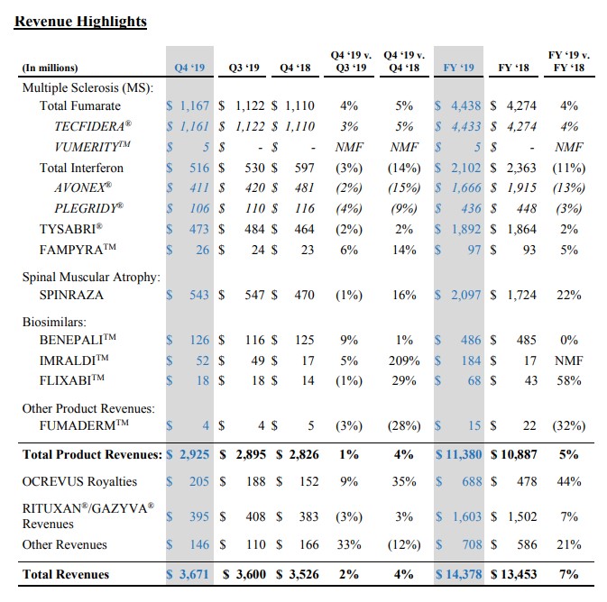 En términos de facturación, Tecfidera para la esclerosis múltiple sigue siendo su producto estrella, al igual que en el 2018. Este tratamiento le generó el mayor volumen de ventas al facturar u$s 4.4 mil millones, y conseguir un incremento anual del 4%.