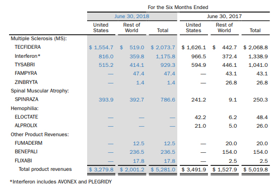 Su caballito de batalla continúa siendo Tecfidera, para esclerosis múltiple. Aunque el mismo reportó ventas planchadas con respecto al primer semestre del 2017.