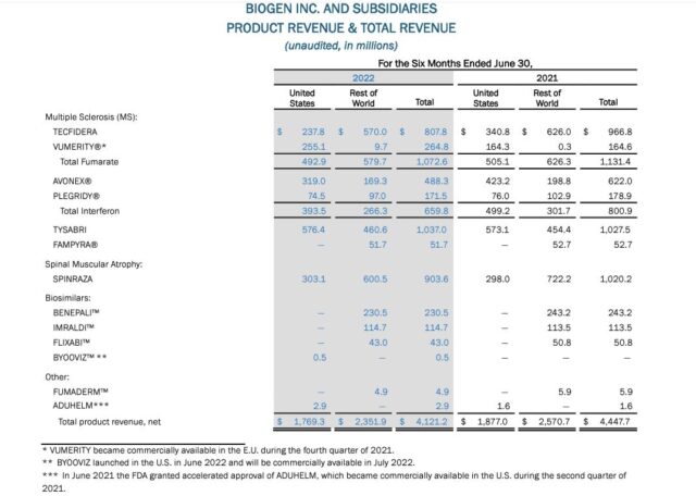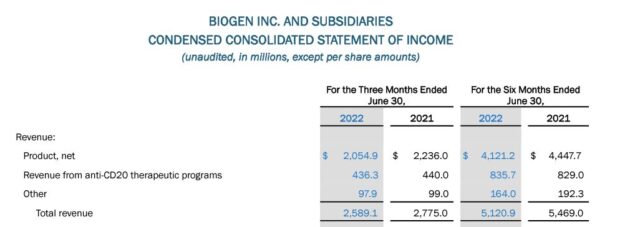 La dueña de Spinraza no logra recuperar sus ventas. Según su último reporte de resultados, en el primer semestre del 2022 su facturación cayó un -6,36% al pasar de u$s 5.469 millones en la primera mitad de 2021 a u$s 5.120,9 millones. Ver Press Release.