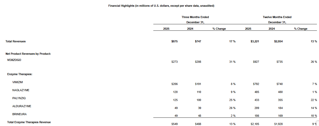 En total, su negocio de terapias enzimáticas osciló un 9% en el 2025, con ventas por u$s 2.105 M. En tanto, su terapia génica para la hemofilia, Roctavian, trepó un 38% y facturó u$s 36 M. En contrapartida Kuvan, para el tratamiento de la hiperfenilalaninemia, continúa derrumbándose, con una baja del -17% en este período, por un total de u$s 100 M.
