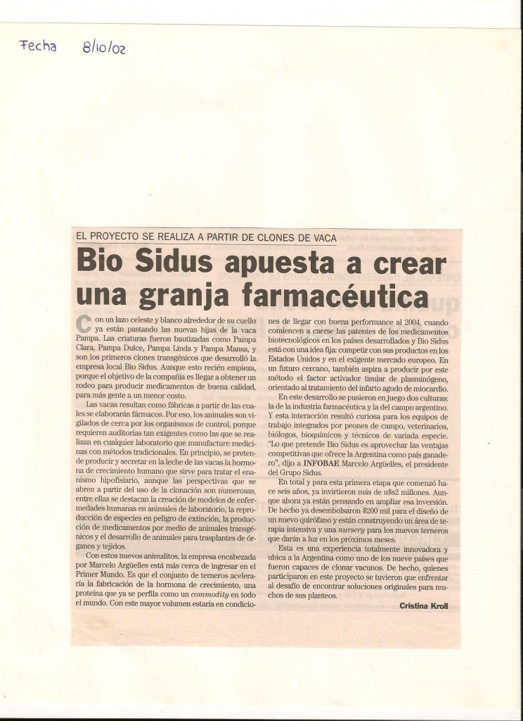 Con estos nuevos animalitos, la empresa encabezada por Marcelo Arguelles está más cerca de ingresar en el Primer Mundo. Es que el conjunto de terneros aceleraría la fabricación de la hormona de crecimiento, una proteína que ya se perfila como un commodity en todo el mundo. Con este mayor volumen estaría en condiciones de llegar con buena performance al 2004, cuando comiencen a caerse las patentes de los medicamentos biotecnológicos en los países desarrollados y Bio Sidus está con una idea fija: competir con sus productos en los Estados Unidos y en el exigente mercado europeo. En un futuro cercano, también aspira a producir por este método el factor activador tisular de plasminógeno, orientado al tratamiento del infarto agudo de miocardio.