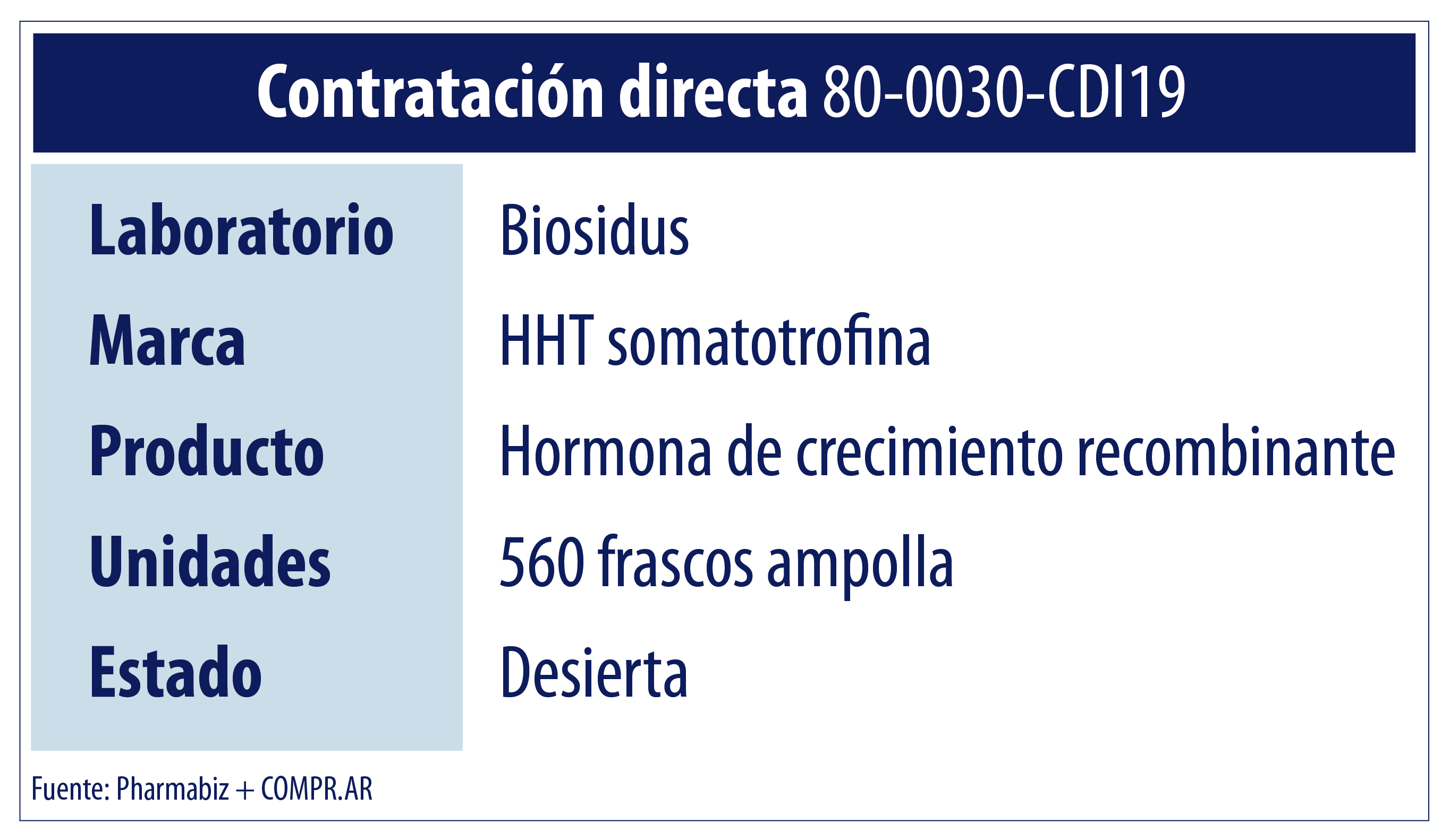 El Estado iba a abrir una Contratación Directa por Exclusividad con el objetivo de adquirir la hormona de crecimiento HHT a base de somatotrofina del laboratorio Biosidus. Sin embargo, al momento la compra fue desestimada, rotulándose como «desierta».