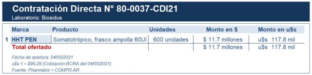 No es la primera vez que el Estado le compra a Biosidus su hormona de crecimiento HHT Pen. Por caso, a fines de septiembre del 2019, la por entonces Secretaría de Salud de la Nación adjudicó un proceso mediante el cual adquirió 560 cartuchos del producto de Biosidus, por una suma de $8.4 millones (u$s 142.5 mil*). La misma se amplió en septiembre del 2020 por 112 unidades y una suma de $1.6 millones (u$s 21 mil**). Ver artículo. Ver contratación directa.