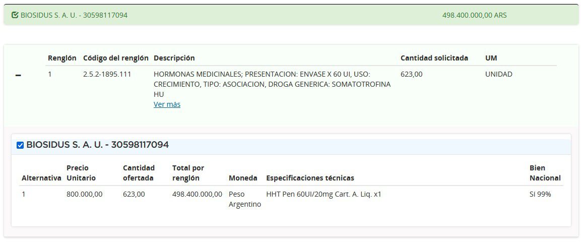 De acuerdo al desglose del equipo de analistas de Pharmabiz, Biosidus presentó una oferta por el total del renglón con su marca HHT Pen, en su presentación de cartuchos prellenados con 3 ml (60UI) de solución inyectable. Ver cuadro comparativo