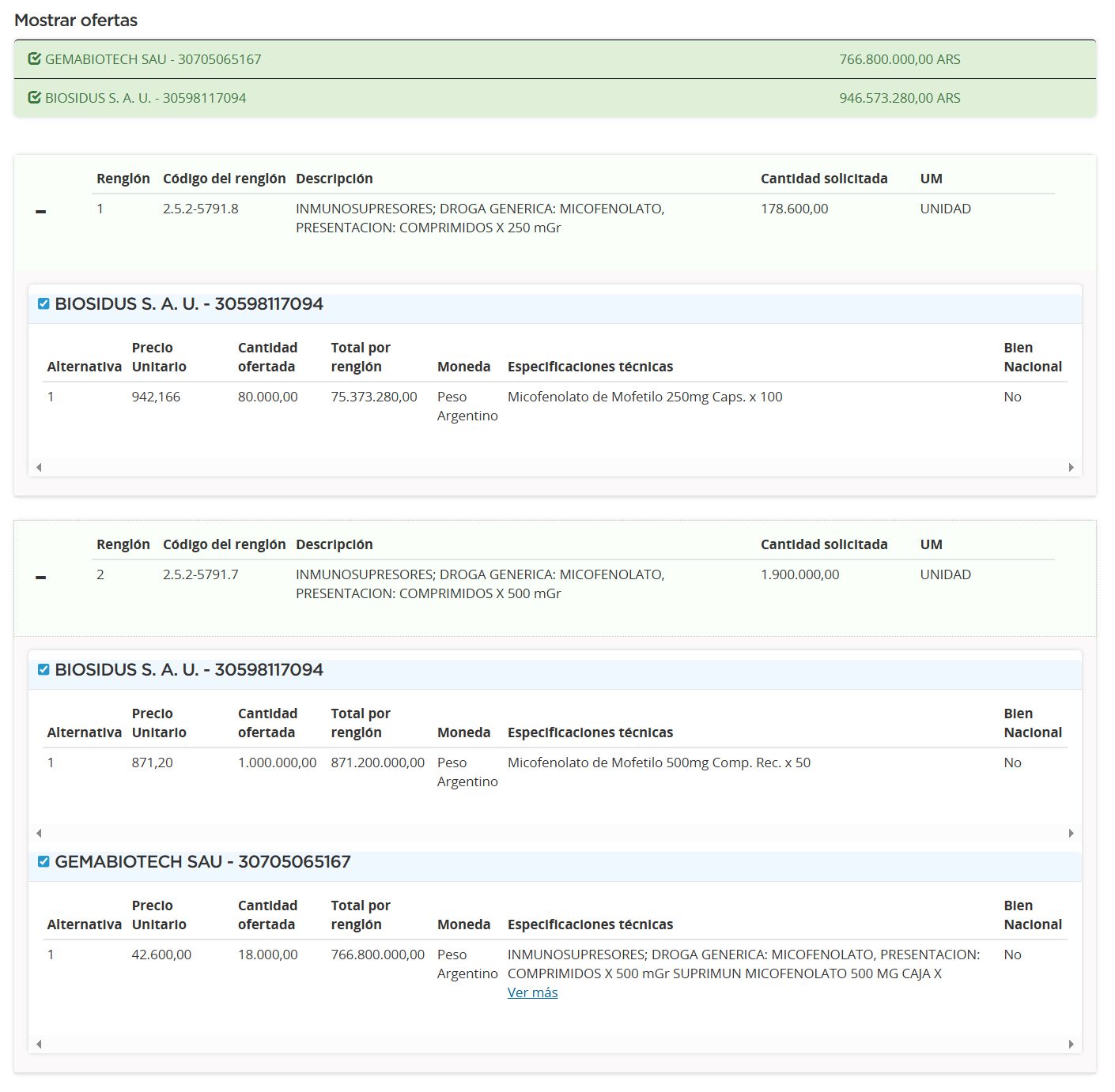 También se presentó el laboratorio Gema Biotech con una cotización de $766 M (u$s 531.024,9). La empresa levantó la mano solo en el segundo renglón.