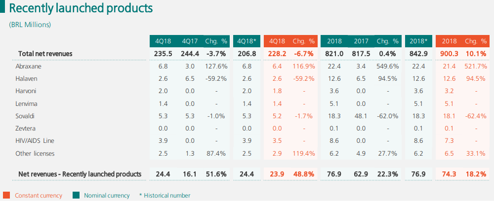En cuanto a las ventas globales del grupo, Biotoscana registró un crecimiento en ventas nominales del 0.4% durante todo el 2018. La compañía alcanzó ingresos por R$821 millones (u$s 216.6 millones) apuntalada por la performance de sus marcas Abraxane y Halaven que marcaron un despunte del 549.6% y del 94.5% respectivamente.