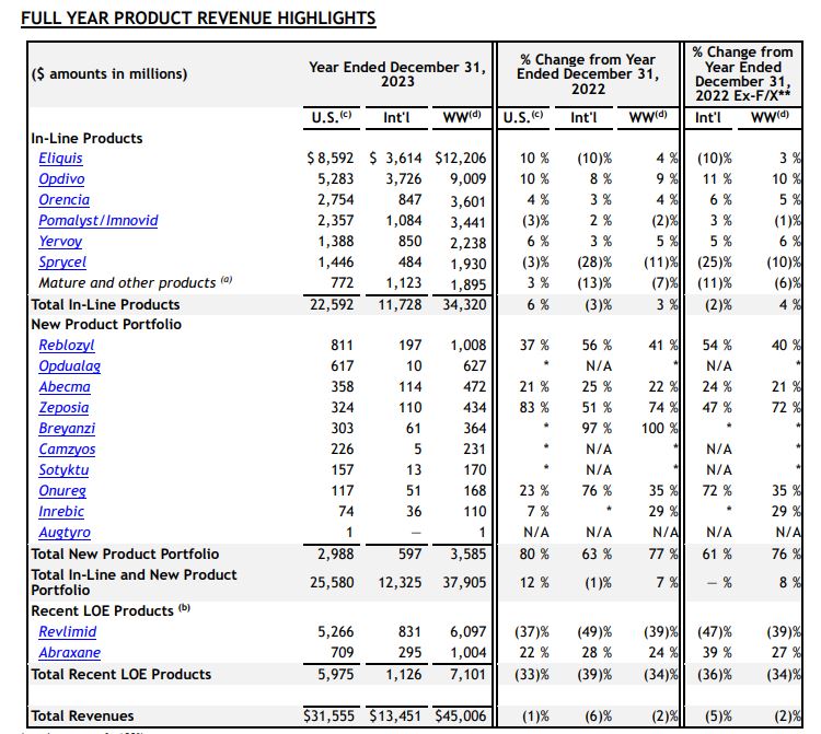 La estadounidense BMS publicó su reporte de resultados correspondiente al 2023. En ese período la multi registró una caída en sus ventas del 2% a un total de u$s 45.006 millones. Su producto estrella, el anticoagulante Eliquis, aportó más de un cuarto de su facturación con un salto interanual del 4%.