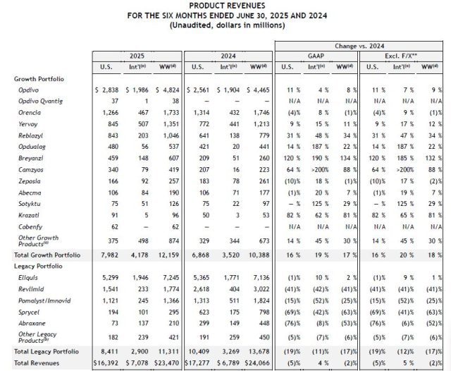 BMS divide su cartera en dos segmentos: Growth Portfolio y Legacy Portfolio. La primera, que abarca sus productos nuevos, aportó u$s 12.159 millones, un fuerte aumento del 17% interanual.