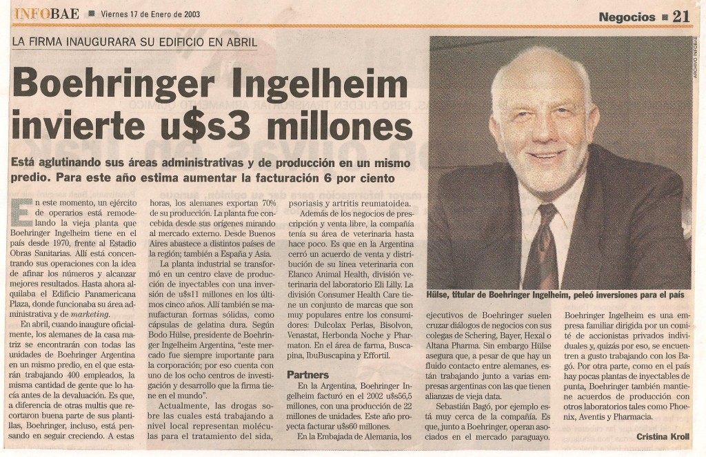 La planta industrial se transformó en un centro clave de producción de inyectables con una inversión de u$s11 millones en los últimos cinco años. Allí también se manufacturan formas sólidas, como cápsulas de gelatina dura. Según Bodo Hülse, presidente de Boehringer Ingelheim Argentina, «este mercado fue siempre importante para la corporación; por eso cuenta con uno de los ocho centros de investigación y desarrollo que la firma tiene en el mundo«.