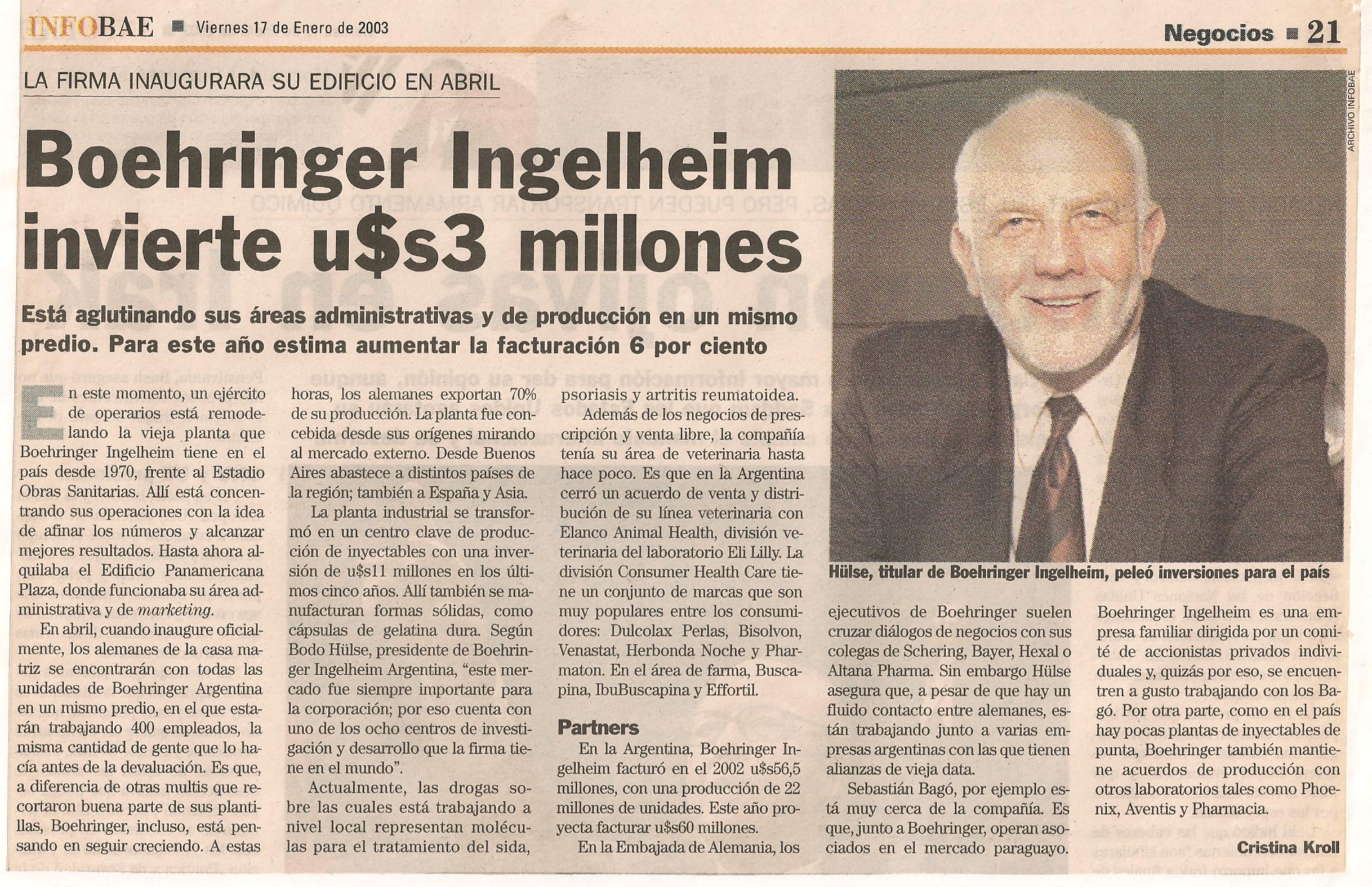 En la Argentina, Boehringer Ingelheim facturó en el 2002 u$s56,5 millones, con una producción de 22 millones de unidades. Este año proyecta facturar u$s60 millones.