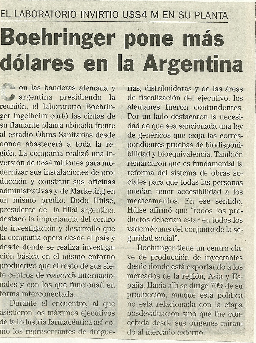 Con las banderas alemana y argentina presidiendo la reunión, el laboratorio Boehringer Ingelheim cortó las cintas de su flamante planta ubicada frente al estadio Obras Sanitarias desde donde abastecerá a toda la región. La compañía realizó una inversión de u$s4 millones para modernizar sus instalaciones de producción y construir sus oficinas administrativas y de Marketing en un mismo predio. Bodo Hülse, presidente de la filial argentina, destacó la importancia del centro de investigación y desarrollo que la compañía opera desde el país y desde donde se realiza investigación básica en el mismo entorno productivo que el resto de sus siete centros de research internacionales y con los que funcionan en forma interconectada.
