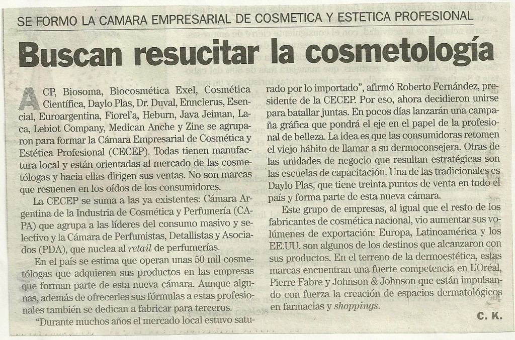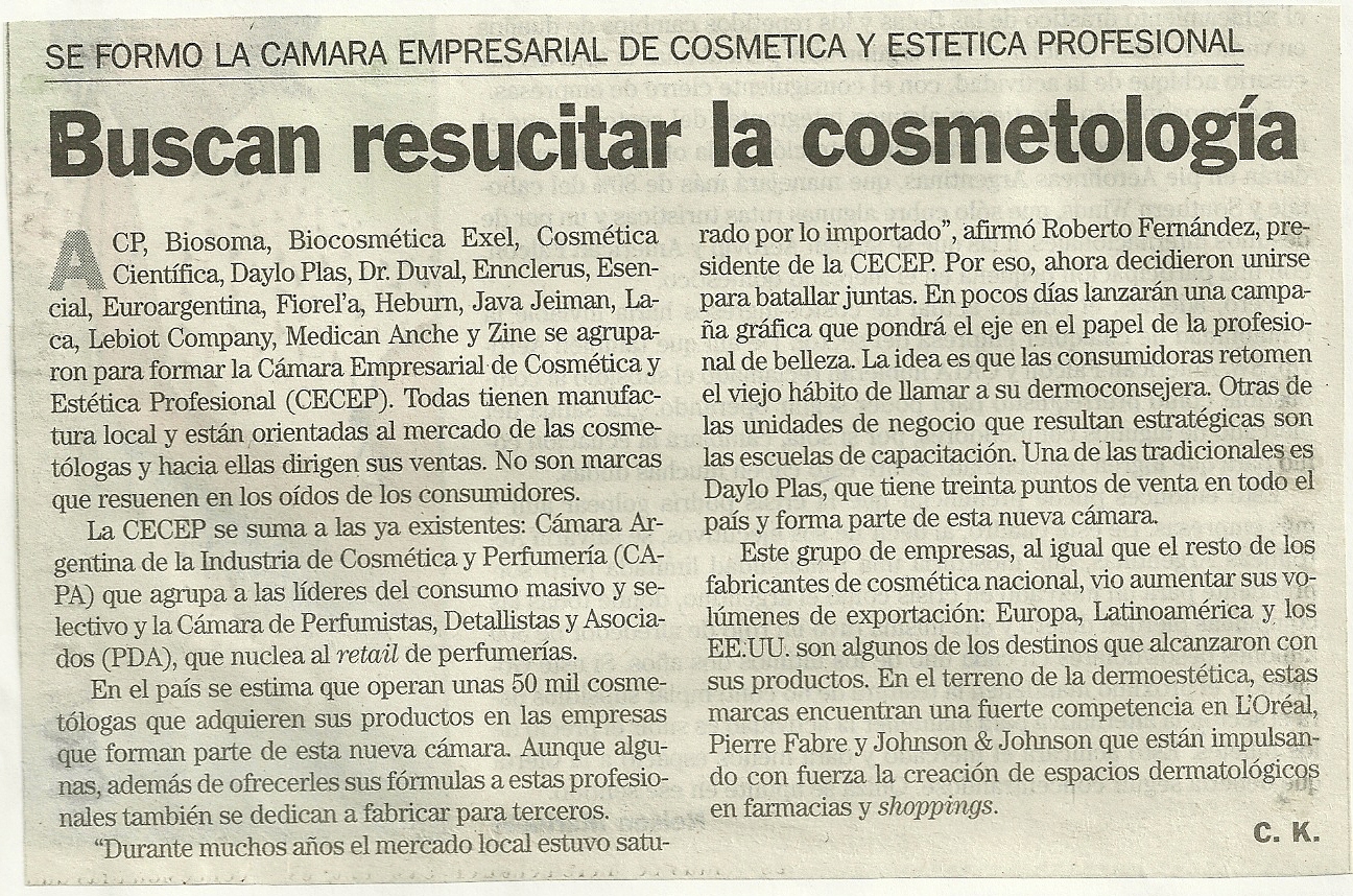 ACP, Biosoma, Biocosmética Exel, Cosmética Científica, Daylo Plas, Dr. Duval, Ennclerus, Esencial, Euroargentina, Fiorel’a, Heburn, Java Jeiman, Laca, Lebiot Company, Medican Anche y Zine se agruparon para formar la Cámara Empresarial de Cosmética y Estética Profesional (CECEP). Todas tienen manufactura local y están orientadas al mercado de las cosmetólogas y hacia ellas dirigen sus ventas. No son marcas que resuenen en los oídos de los consumidores.