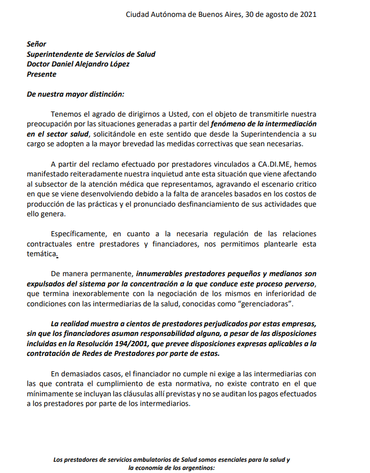 La Cámara de Instituciones de Diagnóstico Médico (CA.DI.ME) renovó su queja ante la Superintendencia de Servicios de Salud (SSS) ante el fenómeno de la intermediación que continúa afectando al sector.