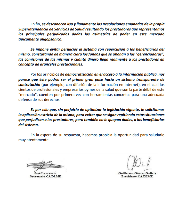 Estas prácticas, según se denunció, redundan en la expulsión del mercado de pequeños y medianos prestadores de manera permanente debido a «la concentración a la que conduce este proceso perverso, que termina inexorablemente con la negociación de los mismos en inferioridad de condiciones con las gerenciadoras”. La misiva, que lleva la firma del presidente de la entidad, Guillermo Gómez Galizia, y del secretario, José Laurensio, destacó que los que aún sobreviven tienen que enfrentar una negociación desfavorable e inequitativa.