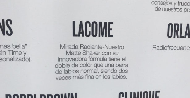 La marca de la división de lujo de L’Oréal, Lancôme, apareció rebautizada con el disparatado nombre de «Lacome«. Estée Lauder figuró sin su acento y los errores no se limitaron a las marcas. En la descripción de Lauder, «técnicas» fue despojada de su acento, mientras que bajo Givenchy ni siquiera pudieron escribir correctamente la palabra «maquilladores», un término tan afín a su métier.