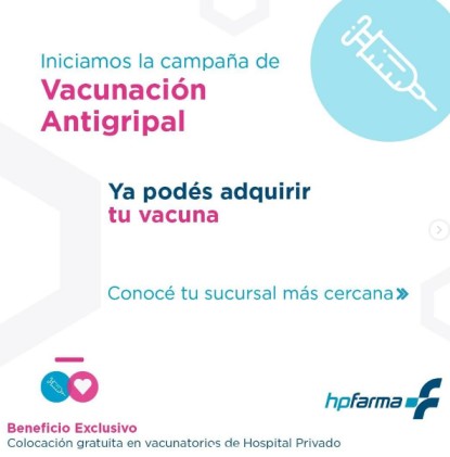 En esta plaza, en la que crece la tendencia de farmacias que son propiedad de clínicas y sanatorios, HP, del Hospital Privado se sumó a la vacunación con la Influvac Tetra de la norteamericana Abbott. Además, publicó en sus redes sobre el beneficio de la colocación gratuita, con la compra de las dosis, en los vacunatorios del hospital. Ver Instagram HP farma.