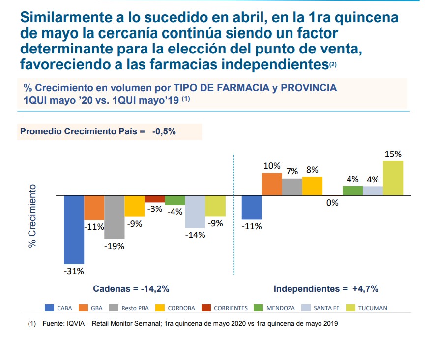 Durante la cuarentena, la cercanía fue el factor determinante para la elección del punto de venta, lo que favoreció a las farmacias independientes. En la primera quincena de mayo las cadenas de mayor peso cayeron un -14.2% en volúmenes en todo el país, según la consultora IQVIA.