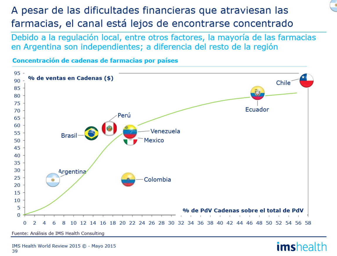 Según datos arrojados por la consultora IMS Health en la última edición del IMS World Review, esto se debe en gran medida a la regulación local que hace que en el país la mayoría de las farmacias sean de tipo independientes.