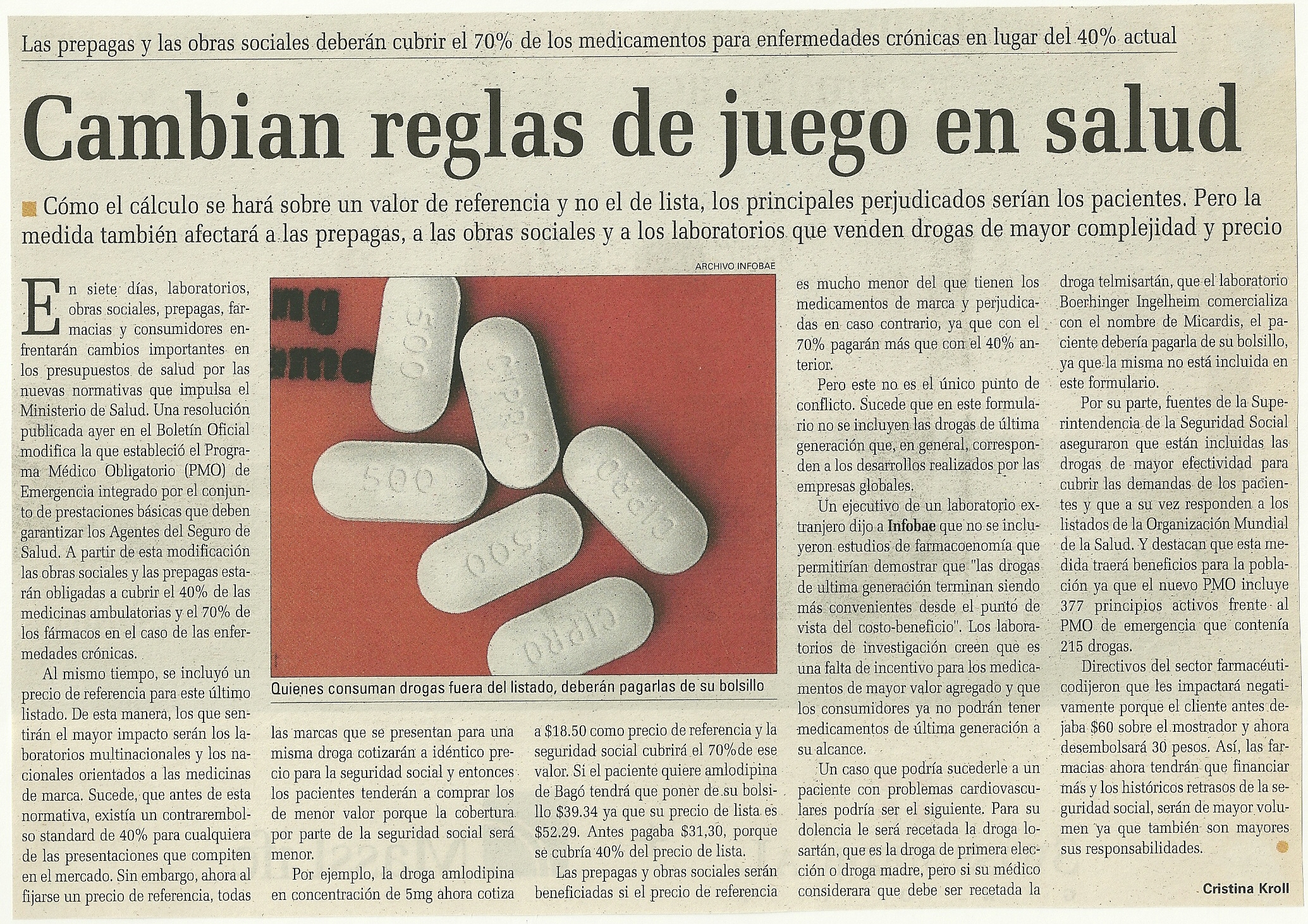 Al mismo tiempo, se incluyó un precio de referencia para este último listado. De esta manera, los que sentirán el mayor impacto serán los laboratorios multinacionales y los nacionales orientados a las medicinas de marca. Sucede, que antes de esta normativa, existía un contrarembolso standard de 40% para cualquiera de las presentaciones que compiten en el mercado. Sin embargo, ahora al fijarse un precio de referencia, todas las marcas que se presentan para una misma droga cotizarán a idéntico precio para la seguridad social y entonces los pacientes tenderán a comprar los de menor valor porque la cobertura por parte de la seguridad social será menor.