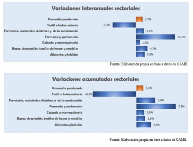 Según la CAME, al cierre de diciembre, el rubro de Farmacias y Perfumerías picó en punta con ventas interanuales de 15.7%. Mientras que Textil e Indumentaria se desplomó un -9,3%. El promedio de todos los rubros fue de 2,7%.