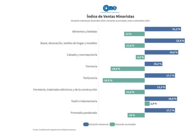 Las ventas minoristas PyMEs acumularon en el 2024 un descenso del -10% frente a 2023. El sector de la Perfumería y el de las Farmacias fueron los más castigados registrando las mayores bajas. Según la CAME, sólo el sector de Textil e indumentaria, escapó a la tendencia negativa del año.