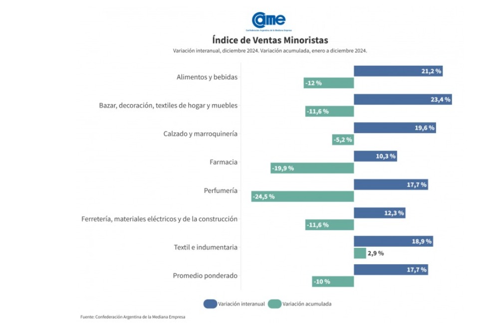 Los datos surgen del Índice de Ventas Minoristas PyMES de la Confederación Argentina de la Mediana Empresa, CAME, elaborado en base a su relevamiento mensual entre 1.262 comercios minoristas de todo el país, realizado entre el lunes 2 y el jueves 3 de enero de 2025.