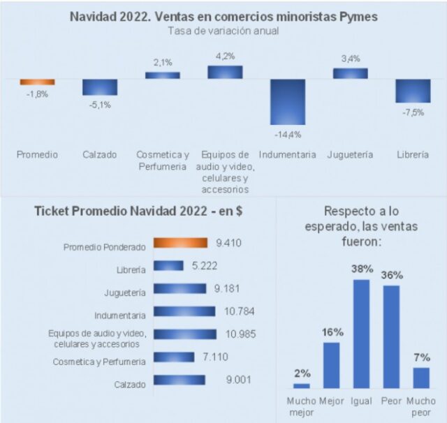 Las ventas navideñas de este 2022 mostraron un ticket promedio de $9.410 (u$s 51.77). Así lo informó hoy domingo la CAME. La indumentaria cayó un -14.4% y la tecnología se alzó un 4,2%.