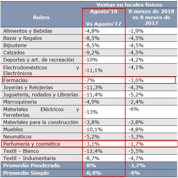 El de Farmacias, a pesar de que los medicamentos siempre se consideran como bienes inelásticos, reflejó una importante caída. Se ubicó en el puesto 12º de la tabla con un derrumbe del -7%. Mientras que Perfumería y cosmética se situó en el último renglón con una baja del -3.1%, constituyéndose en el menos afectado de todos los rubros.