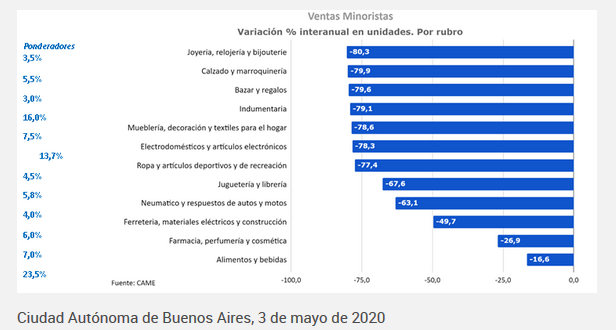 Las ventas minoristas de abril derraparon un -57.6% anual medidas en volúmenes, según la CAME. Esto a pesar de que el mes estuvo marcado por una cuarentena que fue flexibilizándose gradualmente. Ver Comunicado.