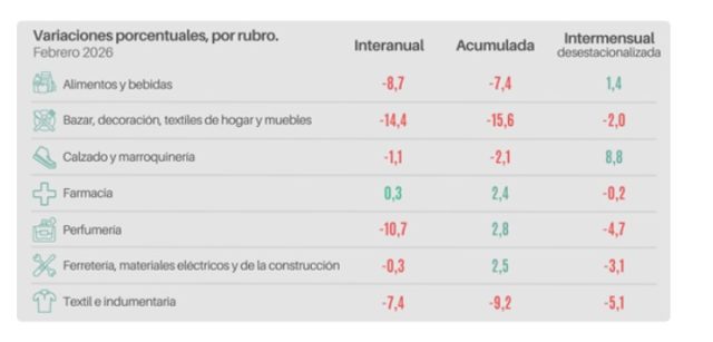 Según la entidad, seis de los siete sectores monitoreados cerraron con resultados negativos. Por caso Bazar y decoración cayó un -14,4%; Perfumería derrapó un -10,7% y Alimentos y bebidas un -8,7%. La institución señaló que el canal Farmacia se constituyó en una excepción, mostrando un incremento del 0,3% interanual.