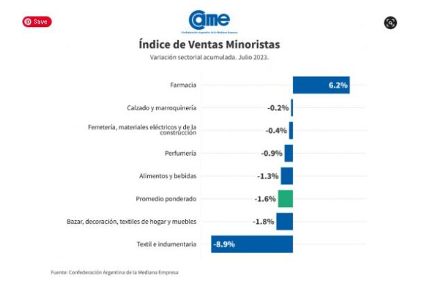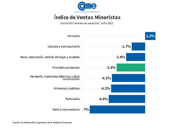 Los datos surgen del Índice de Ventas Minoristas PyMES de la Confederación Argentina de la Mediana Empresa (CAME), elaborado en base a su relevamiento mensual entre 1.273 comercios minoristas de todo el país, realizado entre el martes 1 y el viernes 4 de agosto.