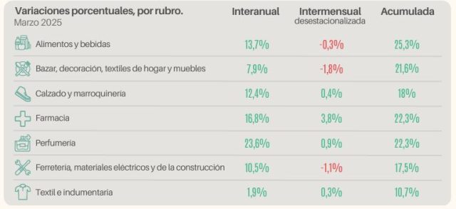 En marzo, los siete rubros relevados registraron subas interanuales en sus ventas. El mejor desempeño se detectó en Perfumerías, cuyo avance fue del 23,6% y le siguieron las Farmacias con un alza del 16,8%. En tercer lugar surgió el rubro de Alimentos y Bebidas, que ascendió un 13,7%. En el acumulado del trimestre, lideró Alimentos y Bebidas con un aumento del 25,3%.