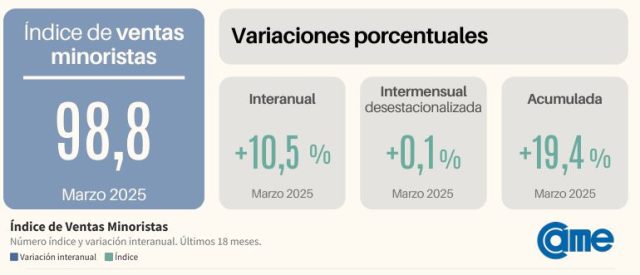En el tercer mes de este 2025, las ventas minoristas crecieron un 10,5% interanual a precios constantes, según el sondeo que realiza la CAME. En la comparación contra febrero exhibieron un ascenso desestacionalizado del 0,1%. El canal Farmacias presentó un incremento del 16,8% en los últimos 12 meses. En tanto, el rubro Perfumerías avanzó 23,6%.