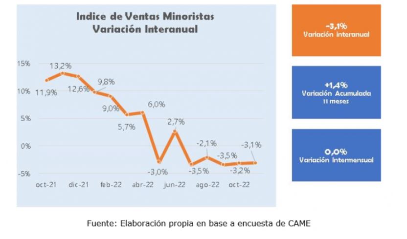 Las ventas minoristas PyMES cayeron -3,1% en noviembre frente al mismo período del año pasado medidas a valores constantes. Esto a pesar de la demanda de merchandising y otro tipo de productos generada en relación al Mundial de fútbol que se juega en Qatar. Es la quinta vez consecutiva en el que se retraen, aunque en los once meses del año todavía acumulan un crecimiento del 1,4% frente a igual lapso de 2021. En la comparación mensual estas ventas se mantuvieron sin cambios.