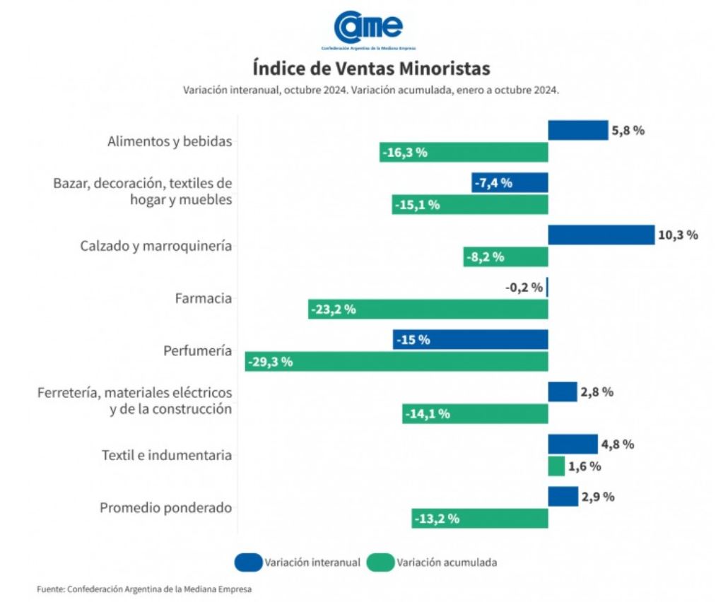 Los datos surgen del Índice de Ventas Minoristas PyMES de la Confederación Argentina de la Mediana Empresa, CAME, elaborado en base a su relevamiento mensual entre 1.300 comercios minoristas de todo el país, realizado entre el viernes 1° y el sábado 2 de noviembre.