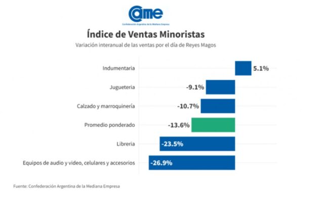 Esta nueva edición del día de Reyes generó un ticket promedio de $28.468 (u$s 33,37). Según la CAME, medidas a precios constantes, las ventas en los comercios minoristas para esta tradicional fecha bajaron un -13,6% en su comparación interanual.