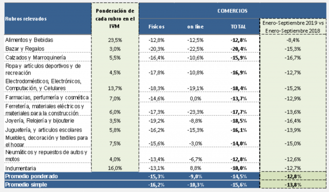La Confederación Argentina de la Mediana Empresa -la CAME– informó que a lo largo de septiembre las ventas en los comercios minoristas tuvieron una caída del -14.5% frente a igual mes del año pasado. Ver Comunicado