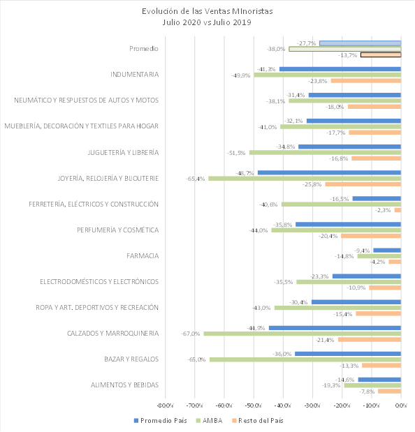 De acuerdo a la entidad, todos los rubros finalizaron en baja afectados por la disminución en los ingresos, la menor circulación de gente en las calles, y las menores posibilidades de empleo en un contexto donde muchos negocios están cerrando sus puertas. Y es por eso que en los primeros siete meses del año, el comercio minorista pyme acumula una caída anual de -31,6% al compararse con el mismo período del año pasado.