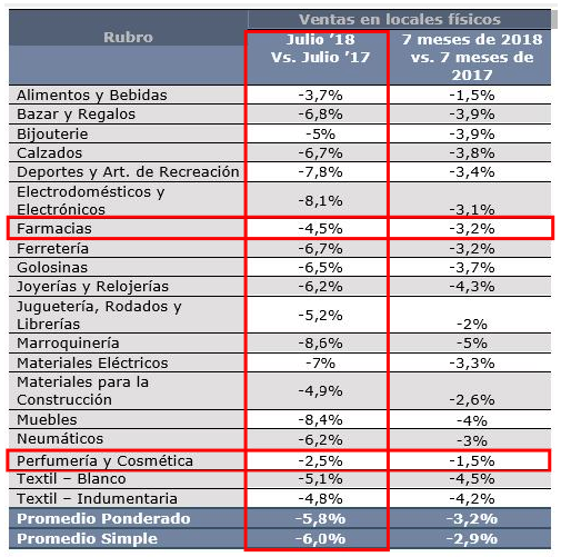 La CAME informó que el volumen de ventas de los comercios minoristas cayeron un -5.8% durante el mes de julio. El rubro de Farmacias por caso, mostró un descenso del -4.5% mientras que Perfumería y Cosmética cayó un -2.5%.