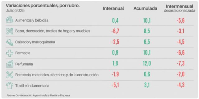 Los datos surgen del Índice de Ventas Minoristas PyMES de la Confederación Argentina de la Mediana Empresa, elaborado en base a su relevamiento mensual entre 1.202 comercios minoristas de todo el país, realizado entre el 1 y 5 de agosto de 2025.