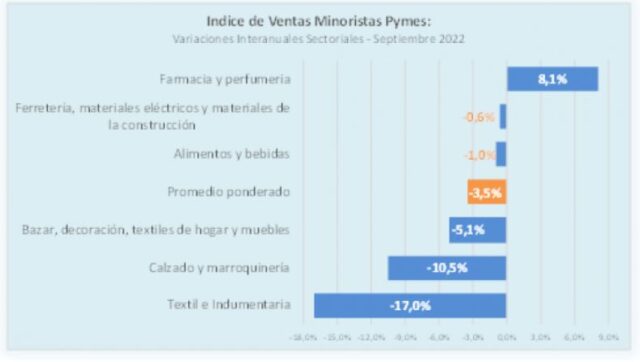 En septiembre, cinco de los seis rubros relevados vieron reducir sus ventas en la confrontación con 2021. En comparación al último agosto, las ventas de las pequeñas y medianas empresas se retrajeron -1,4%, también con cinco segmentos en declive y uno en alza. Ver Comunicado.
