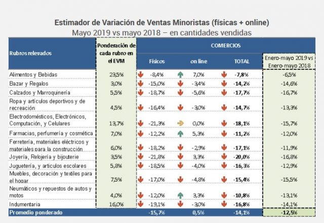En el quinto mes del año las ventas minoristas siguieron en caída en la Argentina. Así lo comunicó la Confederación Argentina de la Mediana Empresa, CAME, cuando informó que en mayo las transacciones tanto físicas como online derraparon en conjunto un -14.1% frente a igual mes del año anterior. Ver informe.