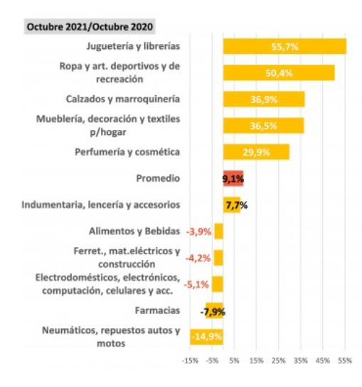 El Índice de Ventas Minoristas PYMES elaborado mensualmente por la CAME, se incrementó un 9,1% frente a octubre de 2020. Las mayores tasas de variación en Jugueterías y librerías (+55,7%) y Ropa y artículos deportivos y de recreación (+50,4%). En cambio, la mayor baja fue en Neumáticos y repuestos de autos y motos (-14,9%).